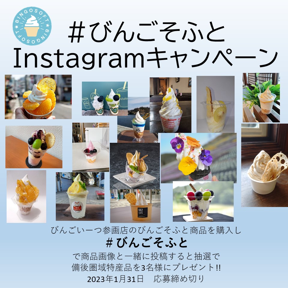 びんごそふと Instagramキャンペーン実施中 #びんごそふと で投稿すると 備後圏域特産品を3名様にプレゼント!! びんごそふと商品を購入してInstagramに投稿してください。 #びんごいーつキャンペーンも実施中です。#びんごいーつも付けて投稿するとよいかも!! 応募締切2023年1月31日まで NEWS一覧へ << >> TOPページへ